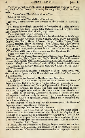 Printed Transcription, 2 page(s), Journal of the House of Representatives, of the Eleventh General Assembly of the State of Illinois, at Their Called Session (Springfield, IL: William Walters, 1839), 8-9